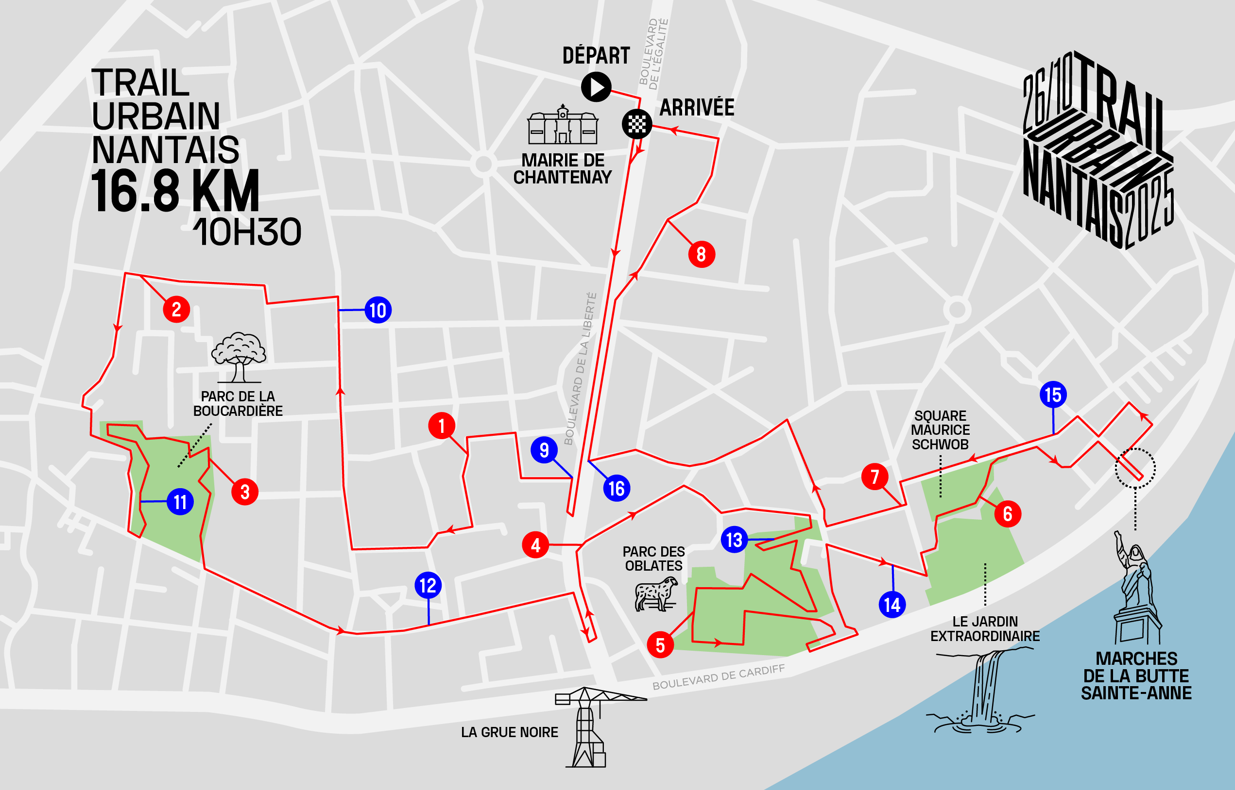 - Le Trail Urbain Nantais ouvert aux coureurs de juniors à masters, sur une distance de 16,8 km, correspondant à deux boucles du circuit. Le départ est à 10H30. ATTENTION, barrière horaire à l'issue de la premier boucle, soit 8,4 km en 1H00 maximum.
