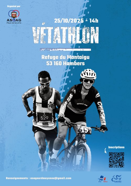 Un vétathlon est organisé le samedi 25 octobre 2025 à 14h00 au refuge du Montaigu à Hambers (53) par la section Nord Mayenne de l’Association Sportive et Artistique de la Gendarmerie (ASAG) des Pays de la Loire.