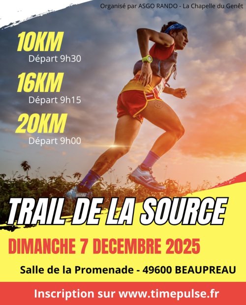 Le TRAIL DE LA SOURCE du dimanche 7 décembre 2025 est organisé par l’Association ASGO RANDO de la Chapelle du Genêt, 49600 Beaupreau en Mauges. (asgorando@gmail.com) C’est une course ouverte à tous, sportifs confirmés ou pas. On y vient pour partager un bon moment de sport en famille, entre amis ou en solo.