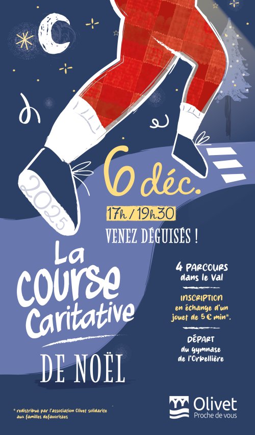 La participation est soumise au don d'un jouet neuf ou en très bon état - d’une valeur de 5 € minimum - à apporter le jour de la course (sans emballage cadeau). Celui-ci sera ensuite redistribué par l'association Olivet Solidarité aux familles défavorisées.