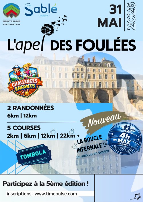 Coureurs à partir de 16 ans. en solo ou en équipe (passage de relais). Le vainqueur sera celui qui aura effectué le plus de boucle dans les 4h de course. Boucle d’environ 2,5kms, Départ et arrivée sur la cour du Collège Saint Anne située : 5, rue Alain de Rougé à Sablé sur Sarthe et emprunte un parcours fléché à travers la commune de Sablé sur Sarthe. (départ à 8h00-Fin 12h00) le dimanche 31 mai 2026 sur la cour du collège Saint Anne. . En application du règlement du CNCHS tout accompagnateur, notamment à bicyclette ou en roller, est interdit, sous peine de disqualification. Des membres de l'APEL s’assureront que tous les participants arriveront au terme du parcours.