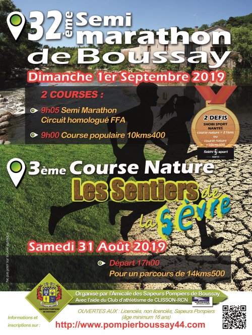 Départ le samedi 31 août 2019 derrière le complexe sportif de Boussay. ( Egalement lieu d’arrivée). COURSE NATURE : Rassemblement : 16h45 Départ 17H00 Départ le dimanche 1 septembre 2019 devant le complexe sportif de Boussay. ( Egalement lieu d’arrivée). SEMI-MARATHON Rassemblement : 8h45 Départ 9h05 COUSE 10 KMS Rassemblement : 8h45 Départ 9h00
