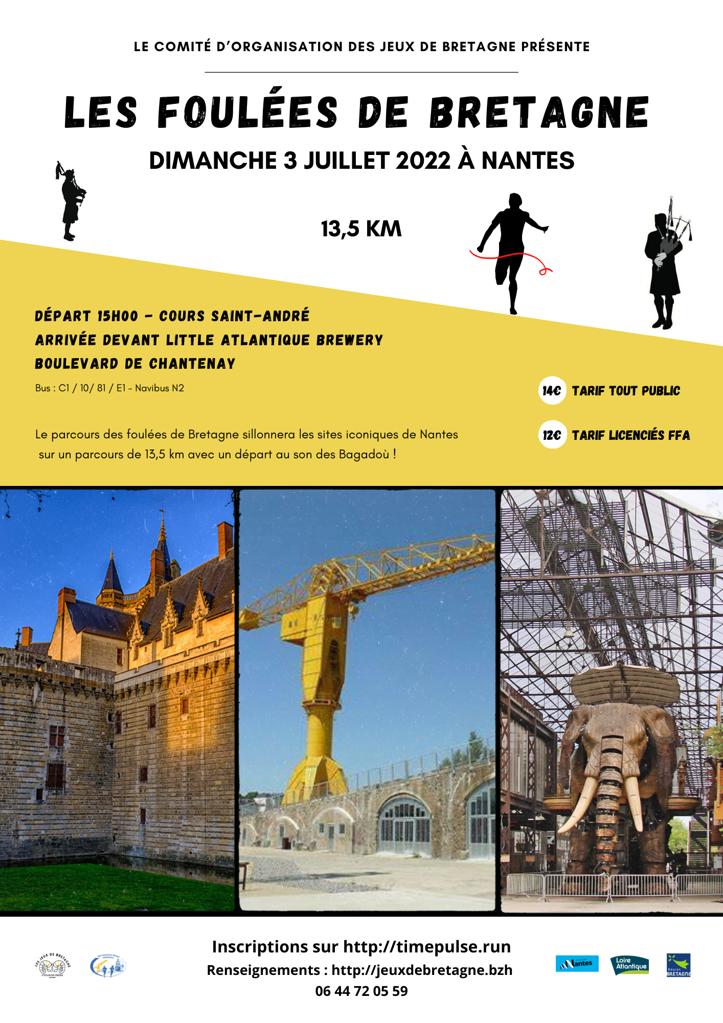 Le parcours est ainsi constitué : départ Quay Ceineray, devant le Cours Saint-André à Nantes, passage sur le Cours des 50 otages, passage sur l’île de Nantes, passage devant le Hangar à Bananes, passage par le pont Anne de Bretagne, passage par les marches du musée Jules Verne, passage dans le quartier Chantenay et arrivée au Boulevard de Chantenay. Distance : 13,5 km. Le plan du parcours est consultable sur le site internet de l’association jeuxdebretagne.bzh. Pour la distance des 13,5 km, tout coureur ne passant pas la distance de 7 km dans un délai d’une heure sera mis hors course. S’il souhaite toutefois terminer la course, il le fera sous son entière responsabilité.