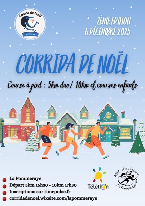 La deuxième édition de la Corrida de Noël est organisée par l'ASEC (Association Sportive et Culturelle) de la Pommeraye (49), en partenariat avec le Téléthon.