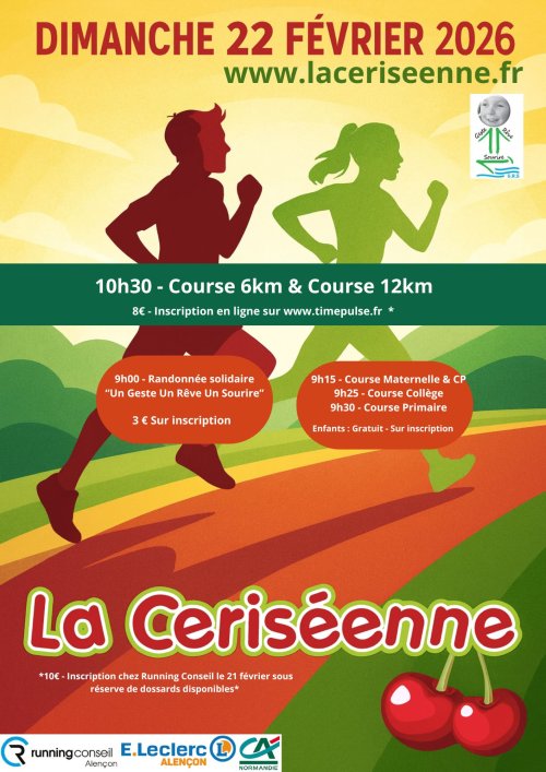 Retrait des dossards le samedi 21 février chez notre partenaire Running Conseils Alencon (10h30- 16h) et le jour de la course à la salle des pommiers (9h - 10h15).