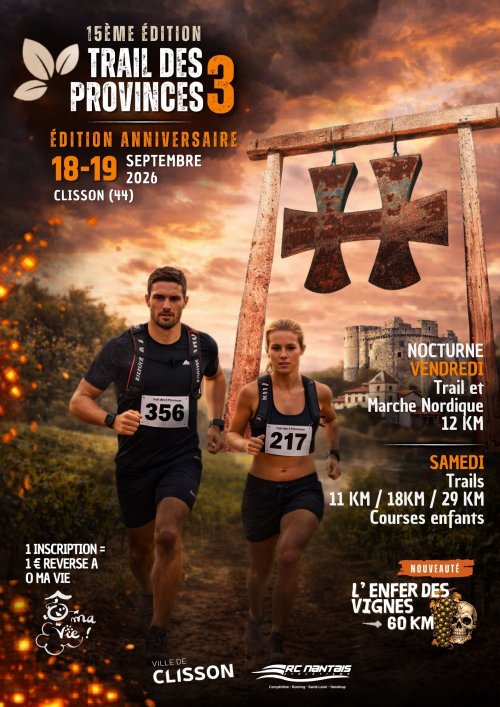 La Section Etoile de Clisson Athlétisme du Racing Club Nantais a le privilège de vous accueillir le vendredi 18 septembre 2026 sur le site du Hellfest pour participer à la 15ème édition du Trail des 3 Provinces.